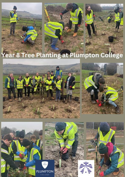 On Monday, a group of Year 8 students travelled to Plumpton College as part of their tree-planting programme. This was also part of our own school's work with increasing biodiversity in the local community. At Plumpton, the students learned about the purpose and value of such planting, learned the techniques to carry out the task, and then got stuck in - in some cases quite literally considering the muddy conditions! Nothing would stop them though, and lots of native species (oak, wild cherry, beech, whitebeam and holly) were soon in the ground.